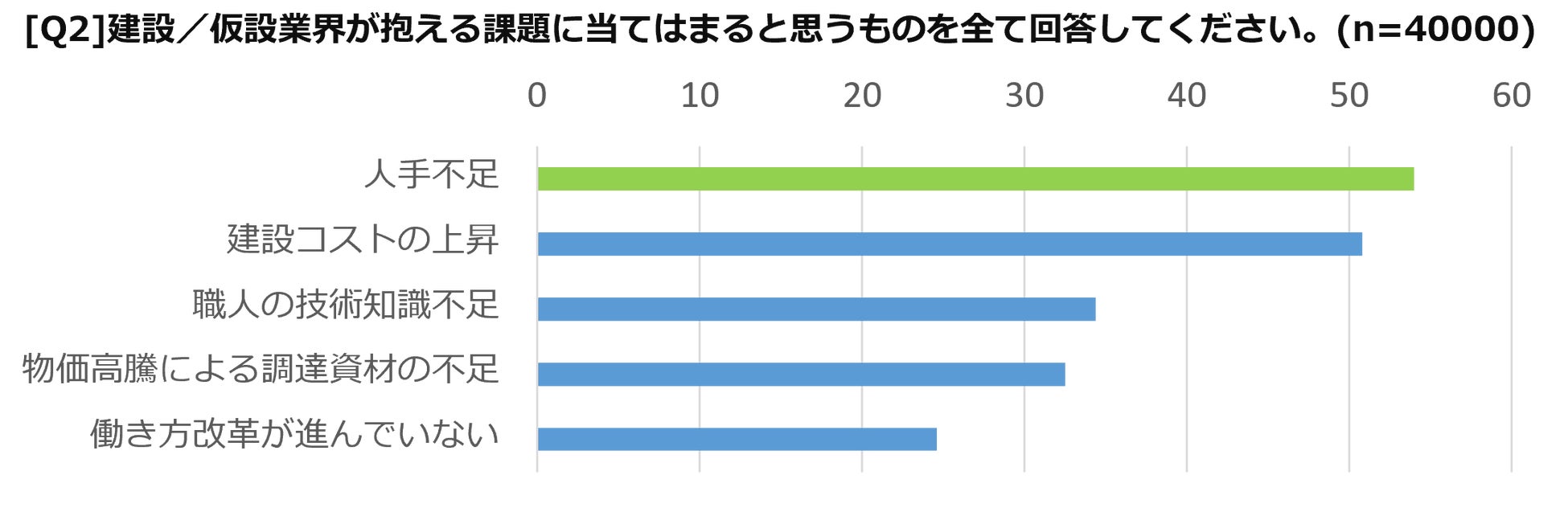近年、建設業界に限らずあらゆる業界の課題として挙げられている、「人手不足」や「コスト増大」に関連する課題をイメージする人が多いということが考えられます。
