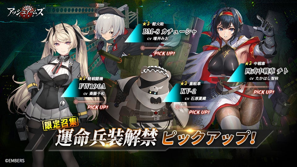 限定DOLLS ★3軽戦闘機「FW190A」、★3 重戦車「KV-2」、★3 中戦車「四式中戦車 チト」と★3 軽火砲「BM-8 カチューシャ」を「運命の相手」として選択できます。