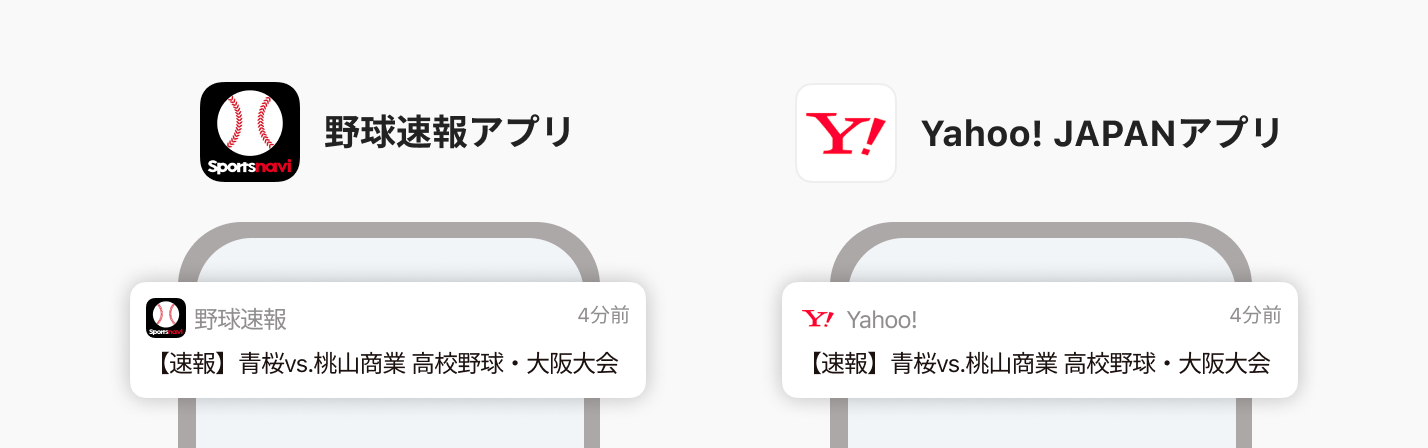 応援しているチームを「フォロー」すると、フォローしたチームの試合開始後に「スポナビ野球速報」アプリと「Yahoo! JAPAN」アプリから通知を受け取ることができます。
