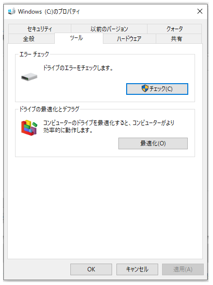 次はディスクチェックを試してハードディスクに発生している問題の自動修復を試してデータ復旧を試みる方法です。