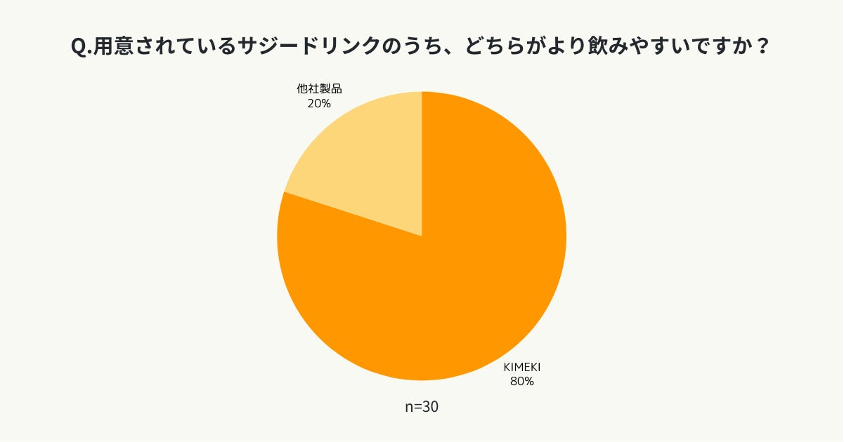 合計30名の方に試飲いただいた結果、80%の方がKIMEKIの『サジーすっきりPREMIUM』の方が飲みやすいと回答いただきました。