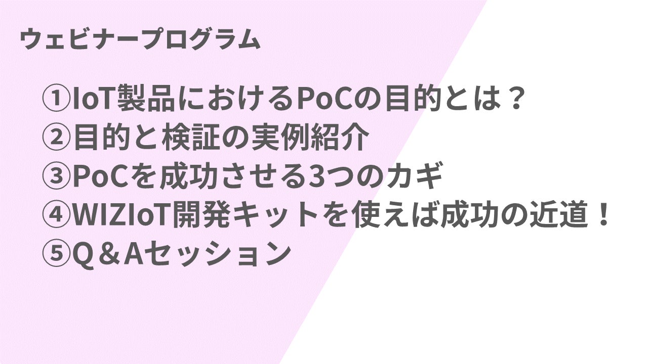 本ウェビナーでは、IoT製品開発においてのはじめの一歩であるPoC検証の重要性に加え、PoCの極意(やるべきこと、コツなど)、当社で、実際行ってきた事例も交えてご紹介させていただきます。機器IoT化をご検討中の方、是非ともご参加ください。