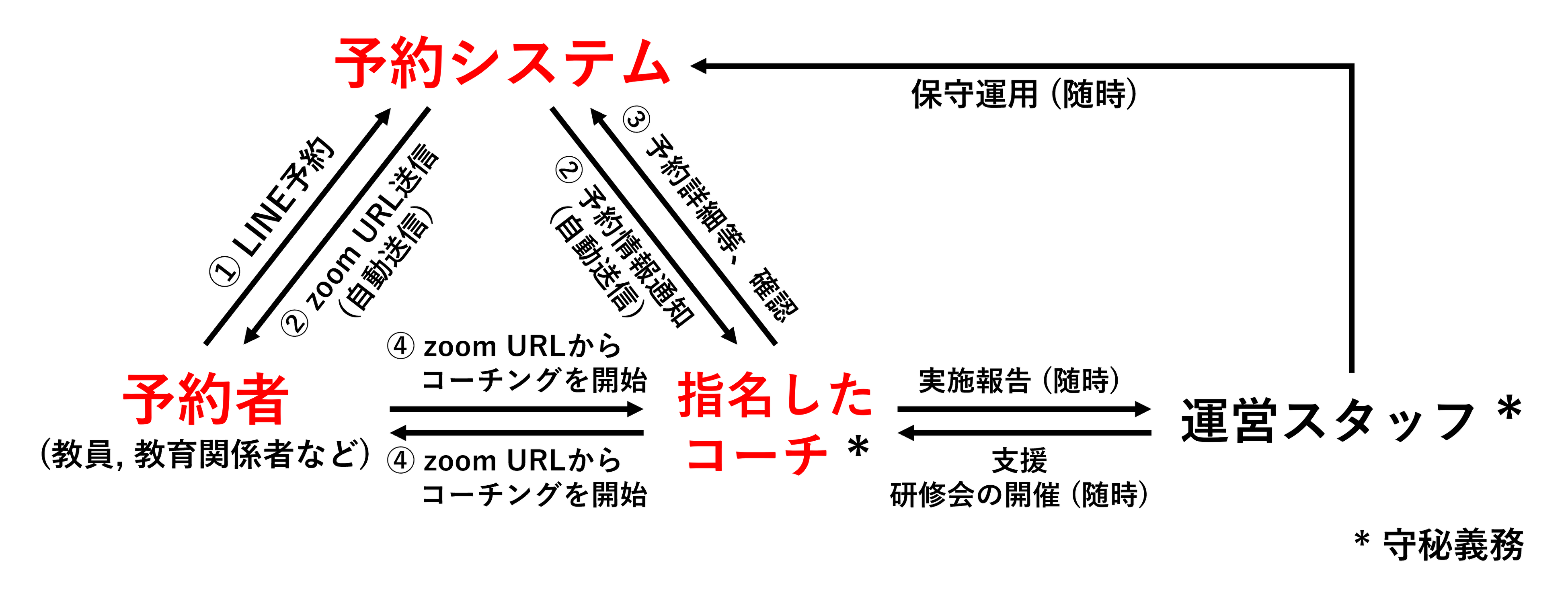 予約者(主に現役教員の方を想定)の方々は、公式LINEアカウントから希望日時・指名したいコーチなどを選択して予約すれば、即時に、当日のコーチングセッションで使用するzoom URLが自動送信される仕組みになっています。