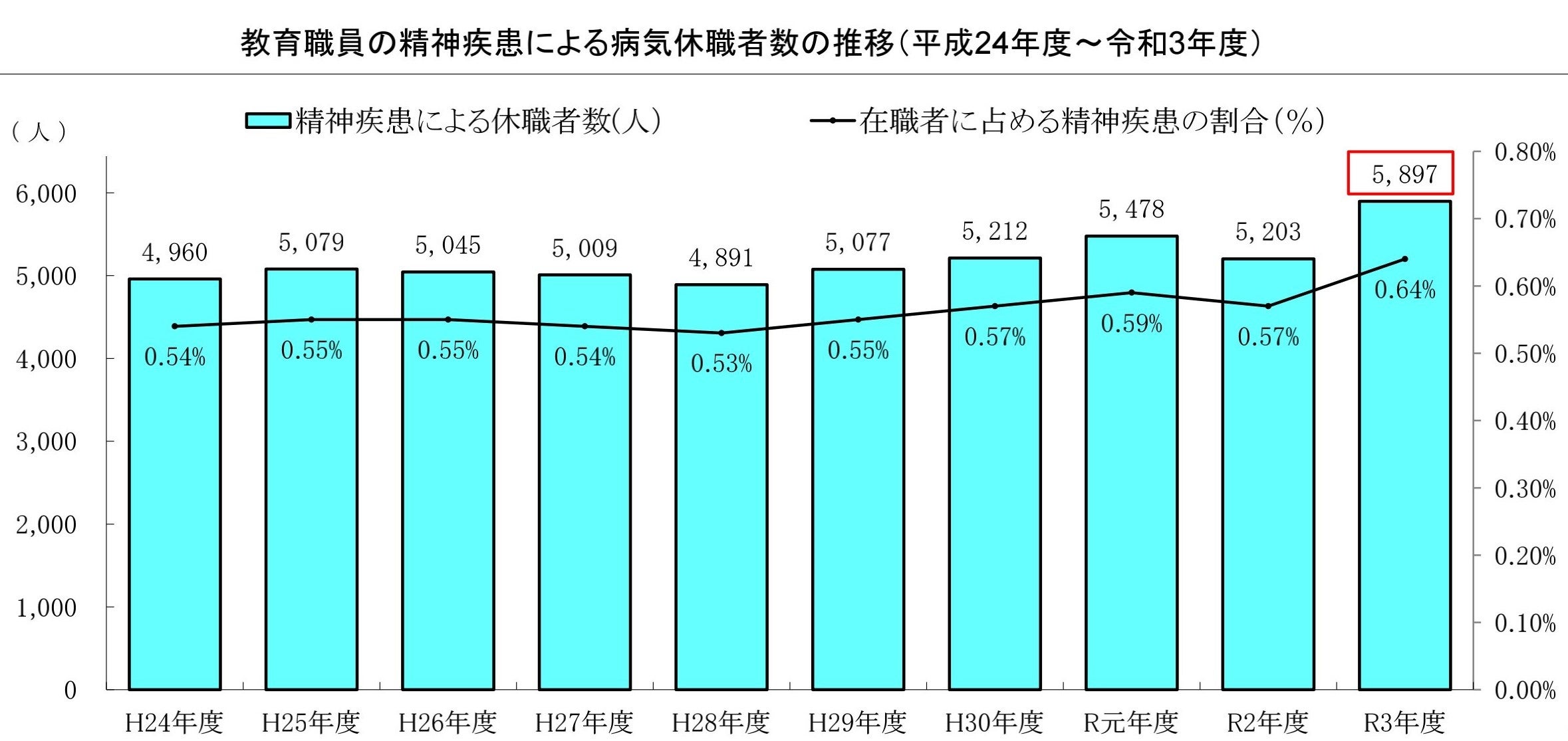 文部科学省の「令和3年度公立学校教職員の人事行政状況調査」によれば、精神疾患を理由に病気休職した公立の小中高校、特別支援学校などの教職員数は、過去最多の5897人(全体の0.64%)を記録しました。