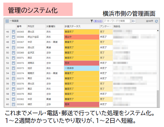 紙で提出していた「避難確保計画」を、システム化することで、関係者全体の作業時間を41%削減。作成する施設と横浜市との連絡の手間をなくし、チェックや差し戻し作業が減ることで、提出完了までの期間を1~2週間から1~2日に短縮できました。管理画面では、各施設の提出状況が一目瞭然となりました。