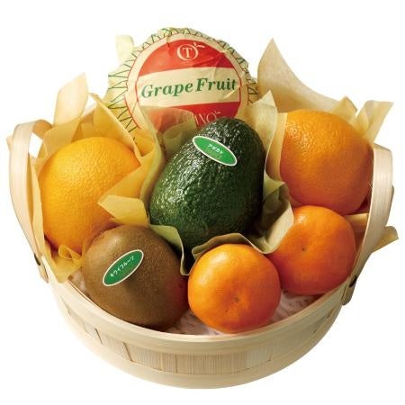 温室栽培みかん<愛知県、佐賀県、大分県または愛媛県産>、オレンジ<アメリカ、オーストラリア、南アフリカまたはエジプト産>×各2、グレープフルーツ<アメリカ、南アフリカまたはトルコ産>、キウイフルーツ<ニュージーランド産>、アボカド<メキシコまたはペルー産>×各1