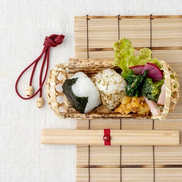 三角の竹篭にすだれを巻いて、紐で結ぶ古風で機能性のあるお弁当篭です。根竹のアクセントが可愛い結び紐を解けば、すだれがそのままランチョンマットに。