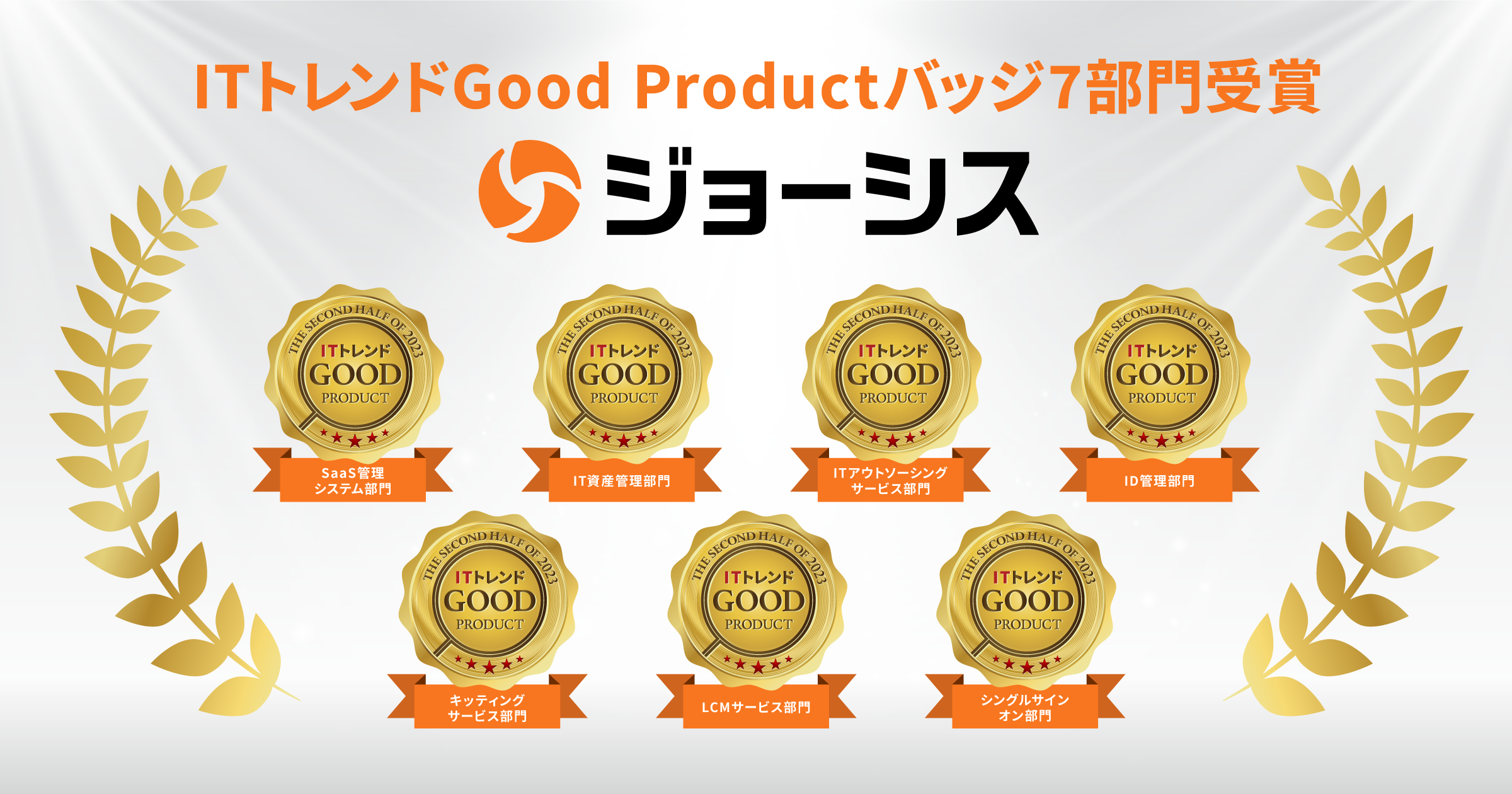 『ITトレンドGood Productバッジ』とは、IT製品の比較・資料請求サイト「ITトレンド」を実際に利用しているユーザーからの評価に基づいて特に優良な製品を認めるものです。参入障壁が低くなった法人向けIT製品の中でも特に多くのユーザー企業のIT化を支援している掲載企業様を称えるとともに、より顧客満足度の高い製品を広めることを目的に発表されました。第6回となる今回は53,809件のレビューを集計し、318製品が認定される中、「ジョーシス」はSaaS管理システム部門、IT資産管理部門、ITアウトソーシングサービス部門、ID管理部門、キッティングサービス部門、LCMサービス部門、シングルサインオン部門の計7部門にて認定されました。うち、6部門はジョーシス単独での受賞となります。