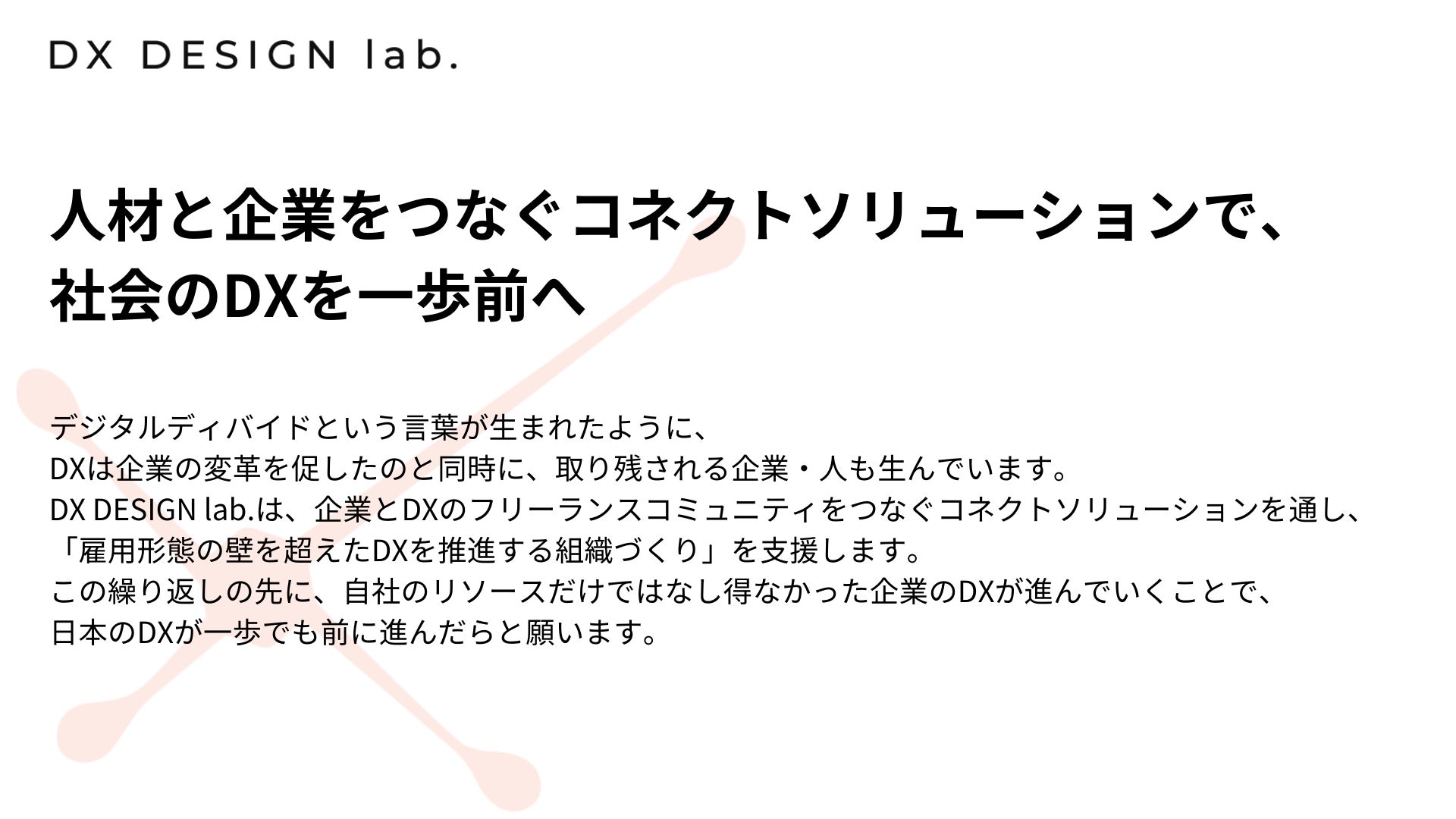 そして新たに2024年1月にリリースしたDX DESIGN lab.では、人材不足によりDXが進まない企業と、実績を積んだフリーランスのDX人材をつなぐコネクトソリューションサービスにより、より本質的な組織課題にフォーカスしたDX支援を行っています。