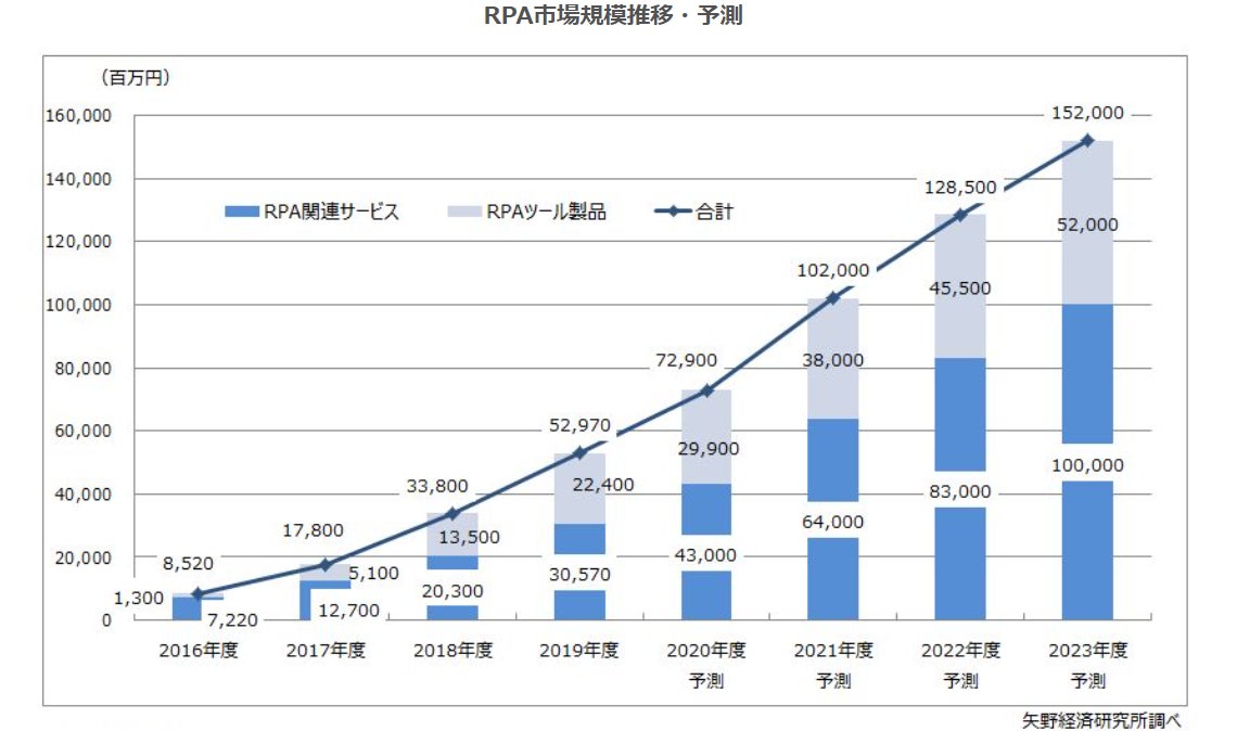 日本のRPA市場規模は、すでに大手のユーザ企業でのRPA利用率は2019年度には高い水準に達していましたが、RPA市場は引き続き急成長を遂げており、市場の勢いは続いていると報告されています。