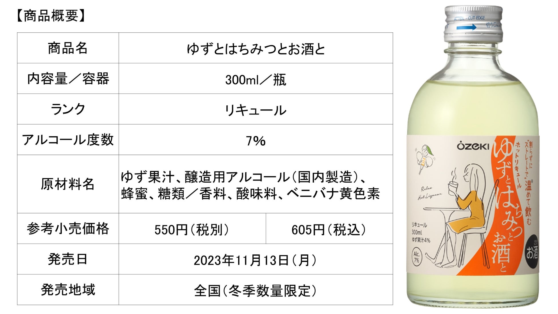 大関株式会社(社長:長部訓子/兵庫県西宮市)は、電子レンジで温めるだけで手軽にホットリキュールが楽しめる「ゆずとはちみつとお酒と300ml瓶詰」を冬季数量限定で2023年11月13日(月)から新発売します。