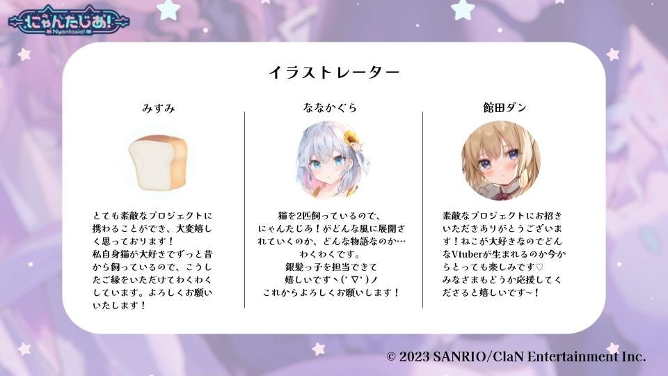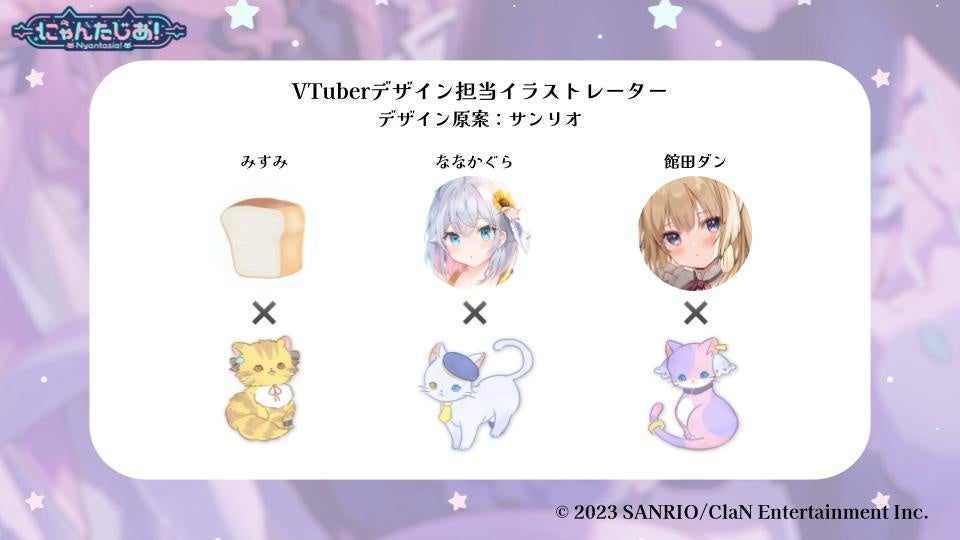 VTuberデザインを担当するイラストレーターには、みすみさん、ななかぐらさん、館田ダンさんの3名に決定!なお、VTuberのデザイン原案はサンリオが担当しています。