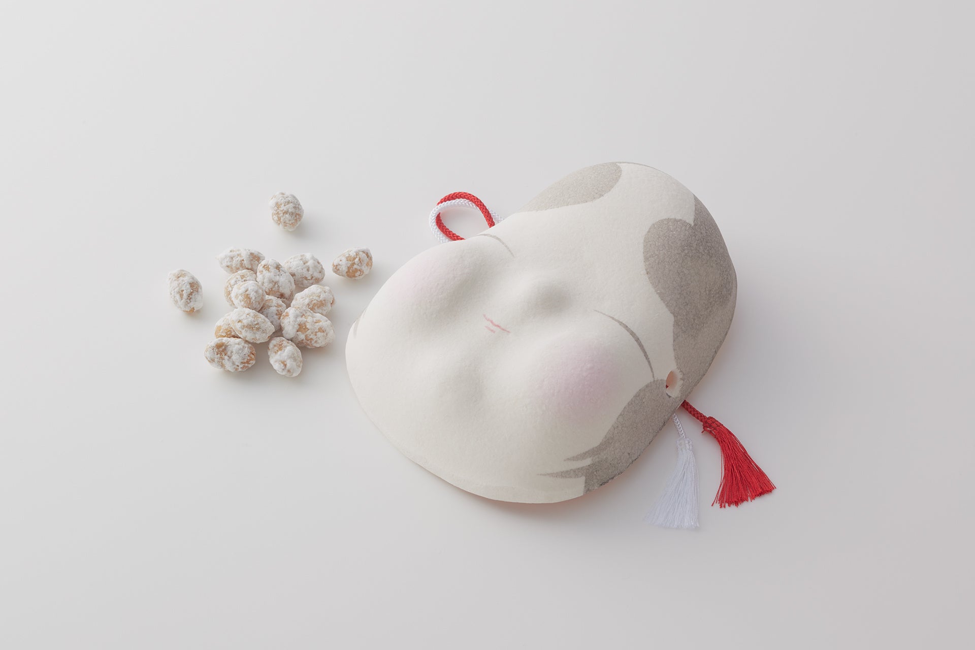 一つひとつ手づくりしたお多福さんの面に、豆本来の旨味や香ばしさを活かし、砂糖をうっすら衣がけした大粒の豆を添えました。