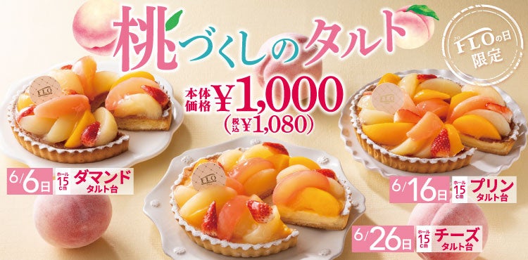 6日、16日、26日とも、6月FLOの日に続き、可愛らしい「3色の桃」をたっぷり使用したホールサイズのタルトがFLOの日限定価格・税込1080円で登場いたします(数量限定)。