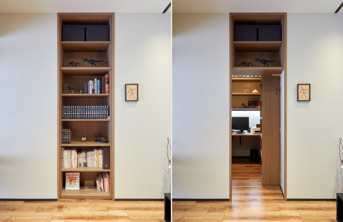壁面の本棚と一体化していて、一見すると扉とわからないつくり。隠し扉の奥は、書斎へと繋がります。本をたくさん入れても扉が開けられるように本棚下にキャスターを仕込み、書斎からでも本棚を使用できるという機能性を持たせました。