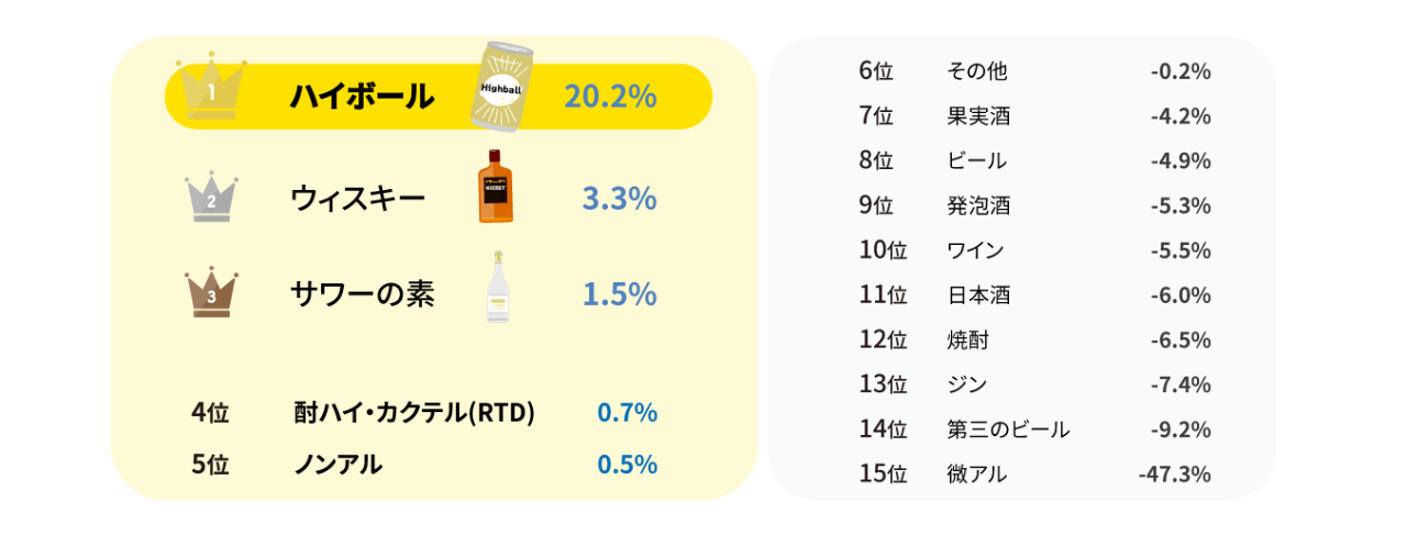 直近1年間(2022年9月~2023年8月)で売上金額が前年度同期間(2021年9月~2022年8月)より伸びた酒類※をランキングにしました。その結果、増加率が一番高いのは近年人気を集めている「ハイボール」で、前年比で+20.2%増加しています。次いで「ウイスキー」、「サワーの素」が続きます。一方、晩酌の定番である「ビール」は前年比で-4.9%、「第3のビール」は-9.2%減少しており、消費者の好みが多様化していることが伺えます。