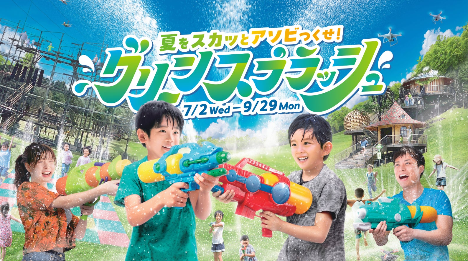 「グリーンスプラッシュ」は、「夏をスカッとアソびつくせ!」をテーマとした夏限定アトラクションです。