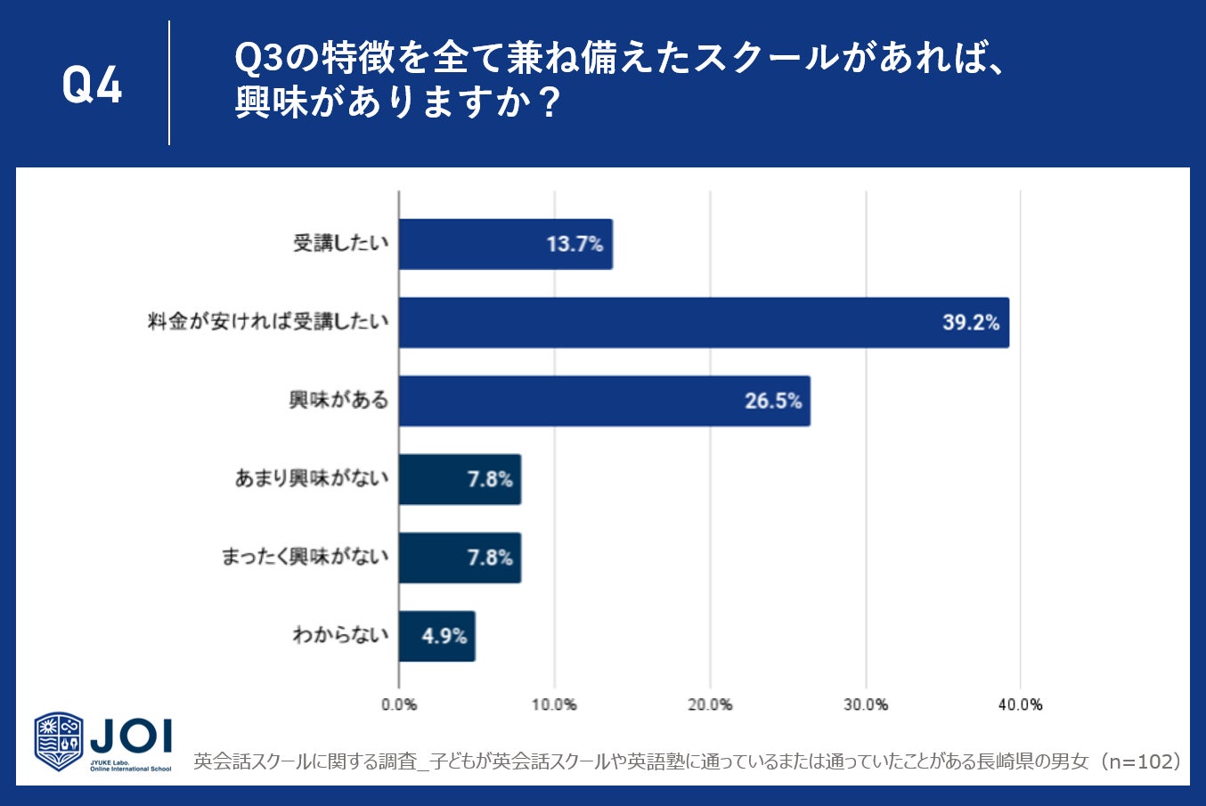 Q4で「Q3の特徴を全て兼ね備えたスクールがあれば、興味がありますか?」と質問したところ、長崎県では13.7%が受講を希望し、39.2%は料金が手頃であれば受講したいと考えています。さらに、26.5%は興味を示していると回答しました。多くの人がこのような特徴を持つスクールに一定の興味を示していることが分かります。