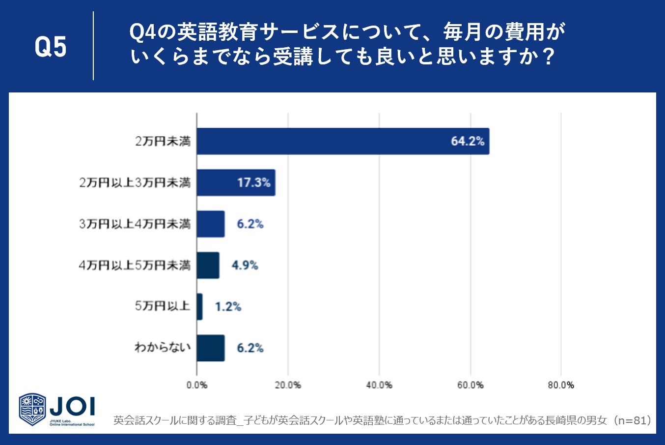 Q4で「受講したい」「料金が安ければ受講したい」「興味がある」と回答した人に、Q5で、「Q4の英語教育サービスについて、毎月の費用がいくらまでなら受講しても良いと思いますか?」と質問したところ、最も多い64.2%の回答者は2万円未満が適切と感じています。17.3%は2万円以上3万円未満、6.2%は3万円以上4万円未満と答えました。対照的に、4万円以上の費用を考える回答者は極少数で、4万円以上5万円未満が4.9%、5万円以上が1.2%でした。これにより、長崎県では多くの人が3万円未満の価格帯を望んでいることが明らかとなりました。