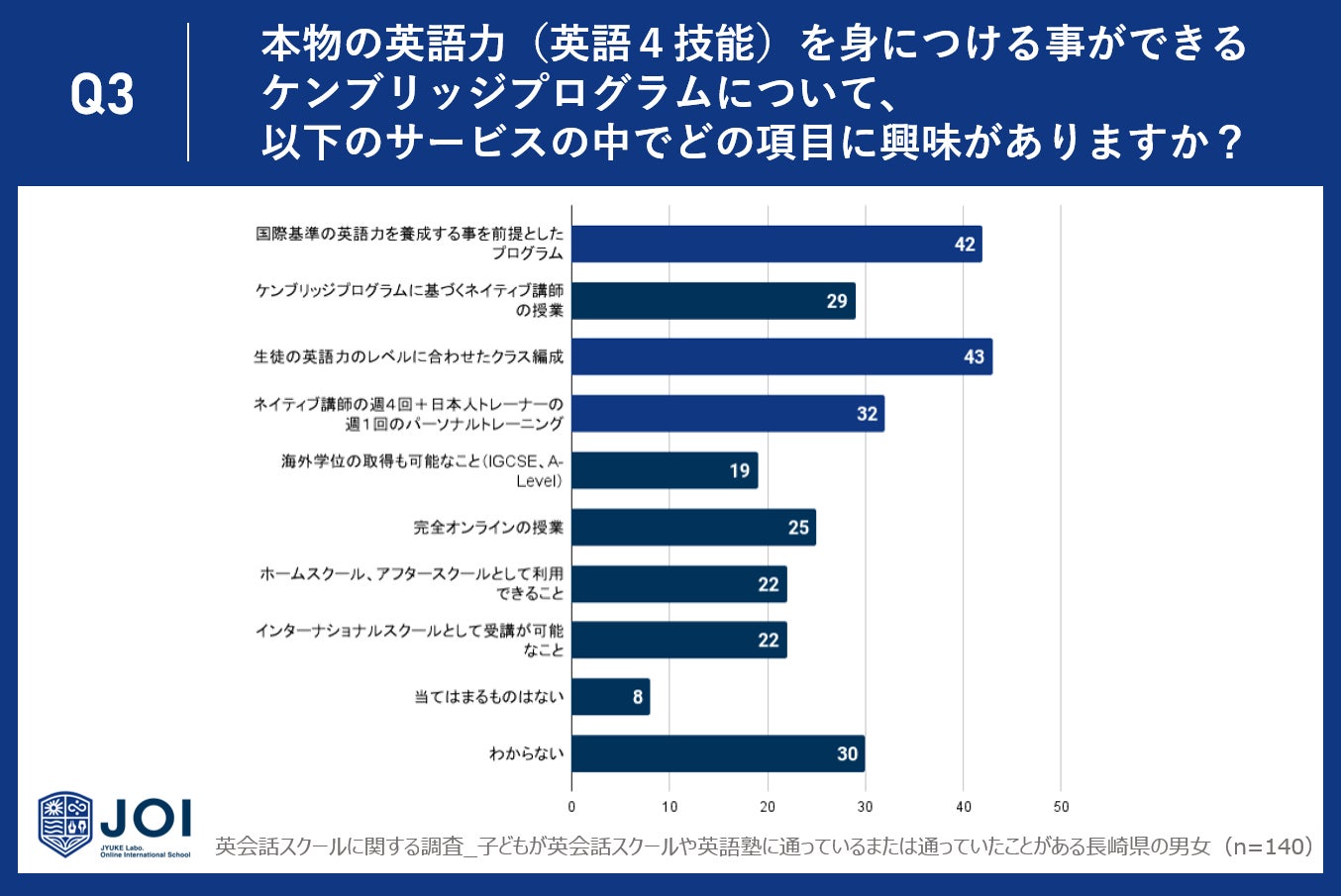 Q3で「本物の英語力(英語4技能)を身につける事ができるケンブリッジプログラムについて、以下のサービスの中でどの項目に興味がありますか?(複数回答可)」と質問したところ、長崎県で最も多かったのは「生徒の英語力のレベルに合わせたクラス編成」で43名でした。次いで、「国際基準の英語力を養成する事を前提としたプログラム」には42名、「ネイティブ講師の週4回+日本人トレーナーの週1回のパーソナルトレーニング」には32名が興味を持っています。一方で、「インターナショナルスクールとして受講が可能なこと」や「海外学位の取得も可能なこと(IGCSE、A-Level)」に関心を持つ人はやや少なめで、それぞれ22名、19名の回答でした。これらの結果から、多くの人は実用的な英語力の養成や個別のニーズに応じた指導に重きを置いていることが伺えます。