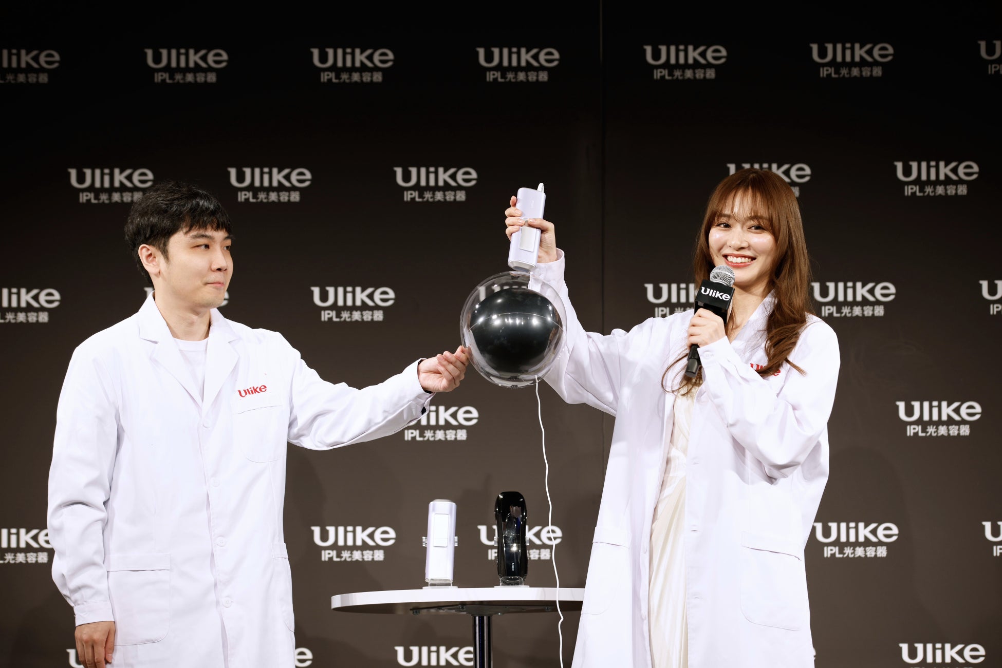 つづいての実験では、透明の風船の中に黒色の風船が入ったものが登場。この風船に内田さんが「Ulike AirPro S IPL光美容器」を照射すると、内側の黒色の風船だけが破裂!「びっくりした~!黒い風船だけ割れましたよ!」と驚く内田さん。実は、光美容器に搭載したIPL光技術により、”黒”色にだけ反応し破壊。実際のムダ毛ケアの仕組みを実験で分かりやすくご覧いただきました。