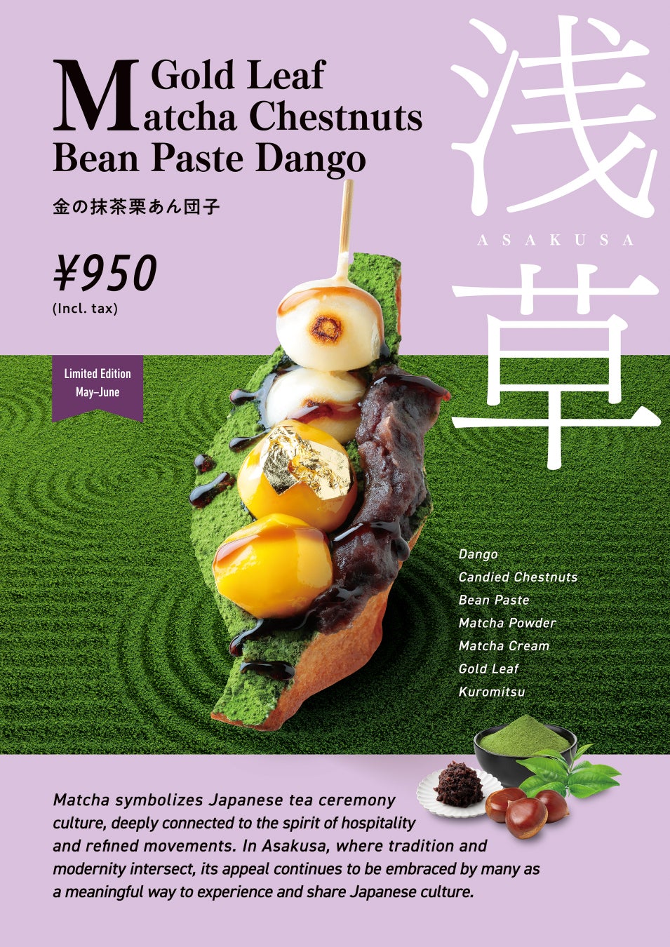 千年の歴史を紡ぐ宇治抹茶―茶道に息づく侘び寂びの精神を、Age.3ならではの“揚げサンド”に昇華しました。サクサク揚げパンに抹茶クリームを包み、抹茶パウダーで深緑の景色を描く。黒蜜のコク、あんこの優しい甘み、栗の甘露煮と団子の素朴な味わいが折り重なり、茶席で供される和菓子の流れを一口に凝縮しました。浅草寺の朱門が映える浅草の町並みを感じながら味わえば、伝統と革新が響き合う“日本文化体験”が完成。日本を旅するあなたへ贈る、ここでしか出会えない抹茶の粋をどうぞ。