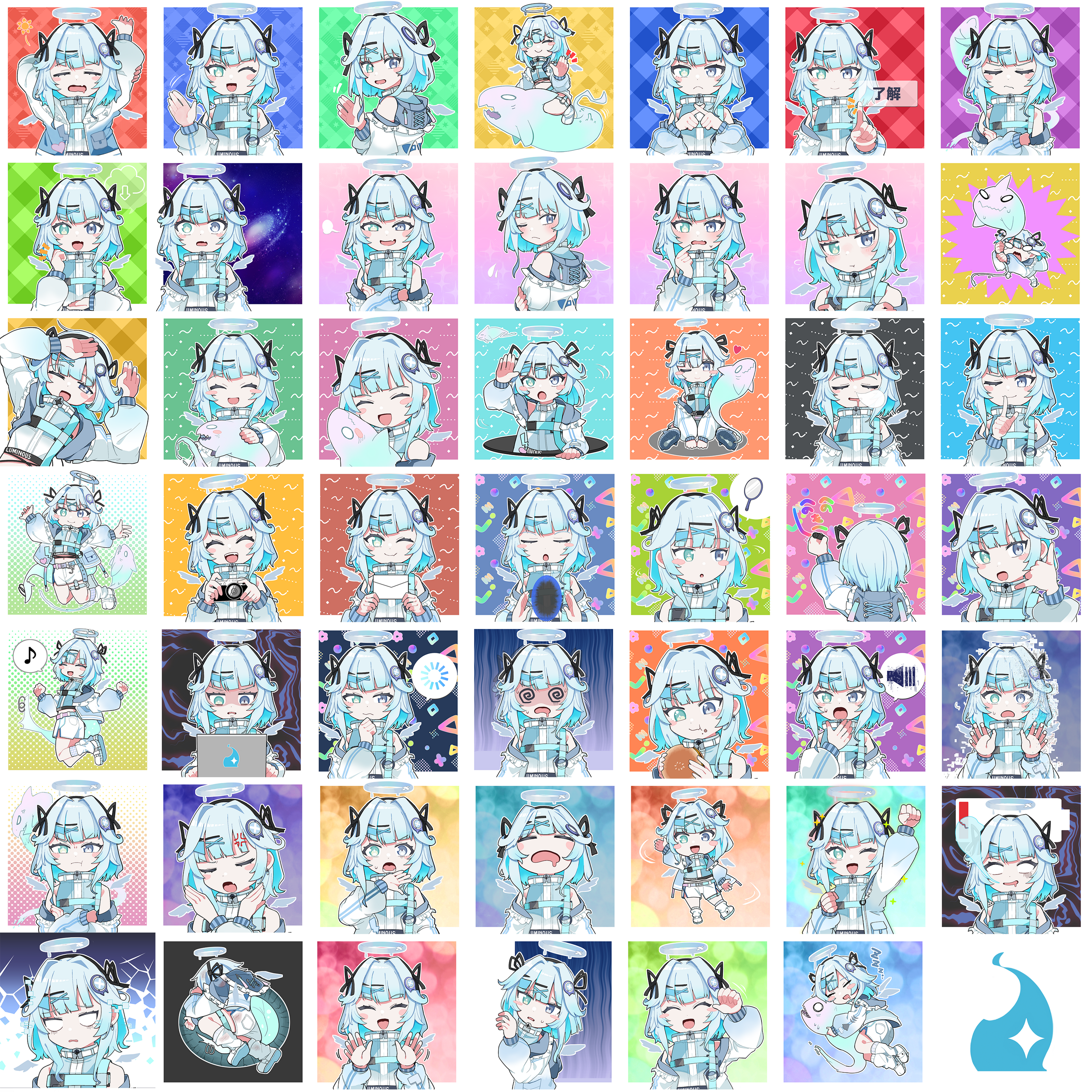 本素材セットには、VRChat Boop機能や動画配信サービス等で使える「ルミアちゃん」のスタンプイラストが48個収録されています。