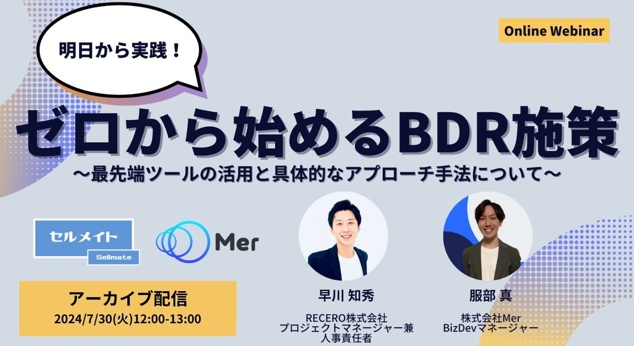 ご好評によりアーカイブ配信決定!BtoB SaaSのインサイドセールス支援事業を展開するRECERO株式会社と株式会社Merは、企業の営業・マーケティング責任者/担当者向けに、「ゼロから始めるBDR施策〜最先端ツールの活用と具体的なアプローチ手法について〜」というテーマの無料のアーカイブオンラインウェビナーを開催します。