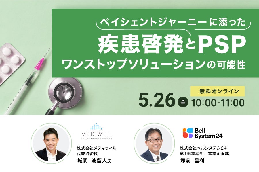 ベルシステム24とメディウィル、製薬企業向けオンラインセミナー「ペイシェントジャーニーに添った疾患啓発とPSPワンストップソリューションの可能性」を5月26(金)に開催