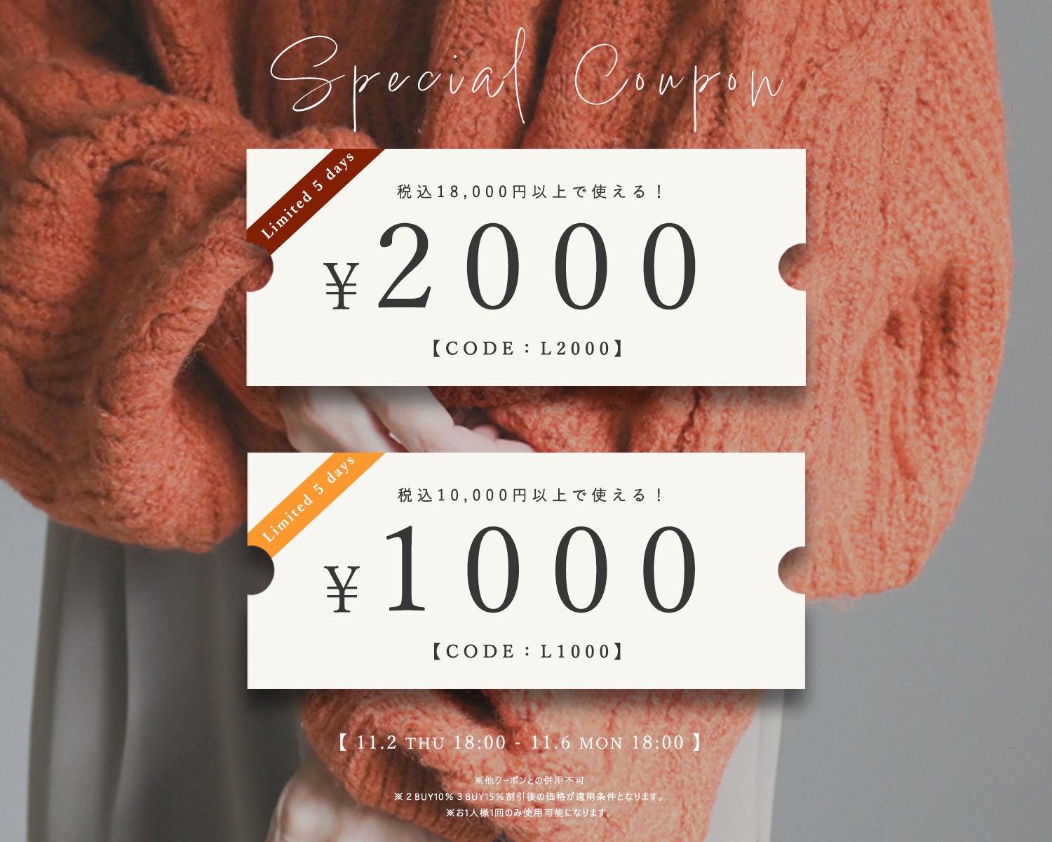 11/2(木)18:00~11/6(月)18:00までの期間中、税込10,000円以上お買い物していただいたお客様に1000円OFFクーポン、税込18,000円以上お買い物していただいたお客様には2000円OFFクーポンをプレゼントさせていただきます。