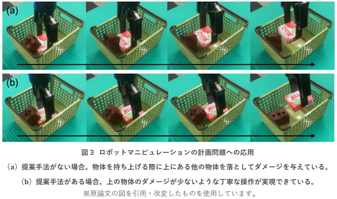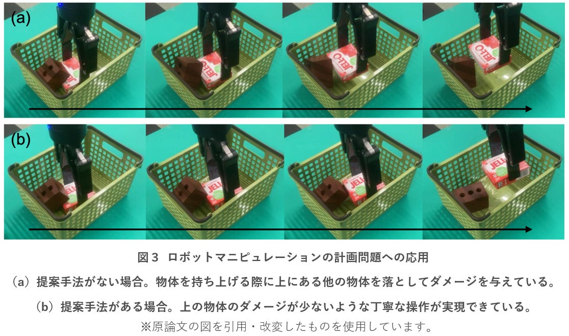 またロボットによる物体操作(マニピュレーション)の計画問題に提案手法を応用しました。図3(a)、(b)に示すように、本提案手法を加えることで、視覚情報だけから、人間のような丁寧な物体操作方法を計画できました。将来器用に物体を操作するロボットへの応用が期待されます。