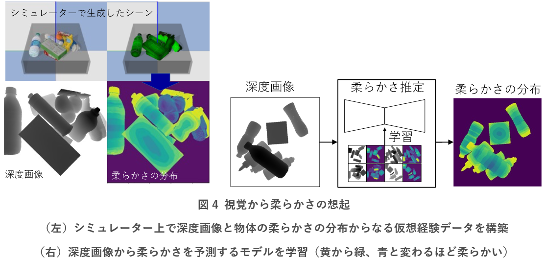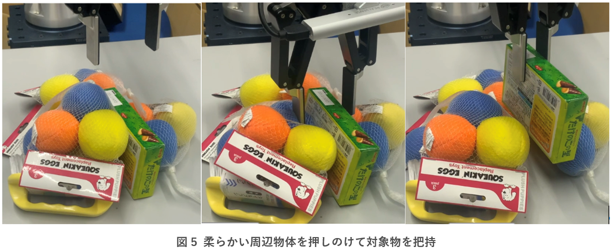 また、これまでに産総研の牧原昂志リサーチアシスタントらは、力の分布と同じような考え方に基づき、物体の柔らかさを推定しました[1]。少数の商品の3Dモデルに対して手動で与えた物体の柔らかさを表すマップを貼り付け、シミュレーション上で大量にデータを生成することで、深層学習モデルに視覚(距離画像センサーによる深度画像)から得られる物体形状と柔らかさの関係を学習させました(図4)。これにより、形状から物体の種類が推定できる場合にシーン中の柔らかさの分布を予測できるようになりました。例えばあるペットボトルの形と柔らかさを訓練すれば、少し形の異なる未知のペットボトルに対しても柔らかさを推定できます。このAIをロボットに適用したところ、物体把持に関する最新手法であるDex-Netと比較して、作業成功率は同等でかつ把持対象の物体のつぶれは70%以上抑えられることがわかりました。また、逆に形状だけから判断すると把持できない状況で、柔らかさを利用して周辺のものを変形させて押しのけて把持するという人間らしい行動をロボットがとることにも成功しました(図5)。