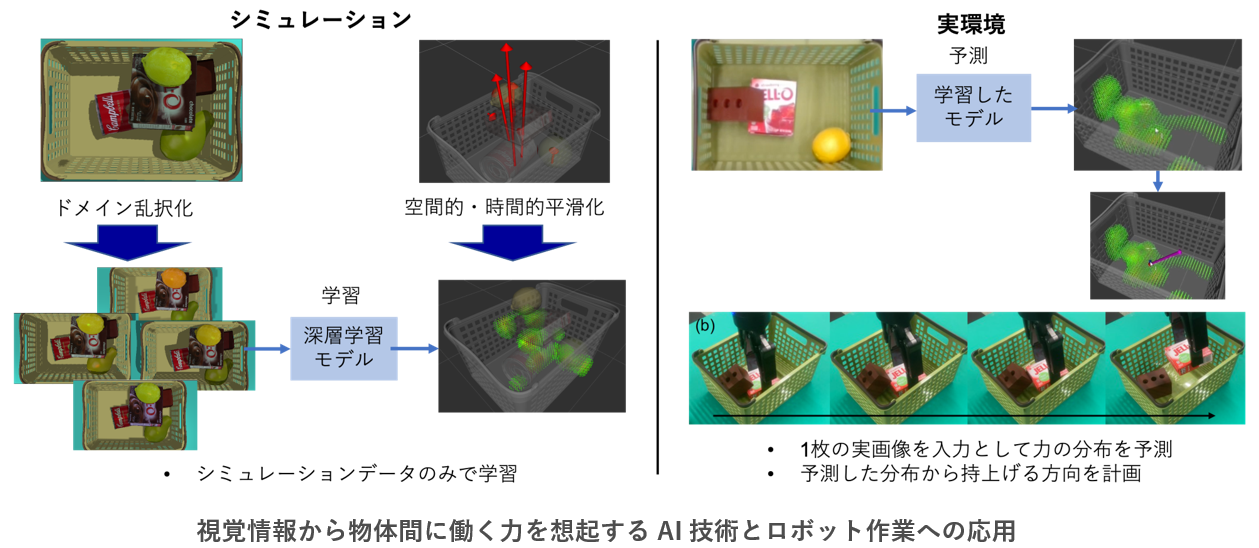 産総研は、シミュレーションを利用したロボットの認識や動作生成技術の研究を行ってきました。本研究ではその知見を生かし、画像から物体間にかかる力の分布を想起するAI技術を開発、ロボットへの応用の可能性を探りました。