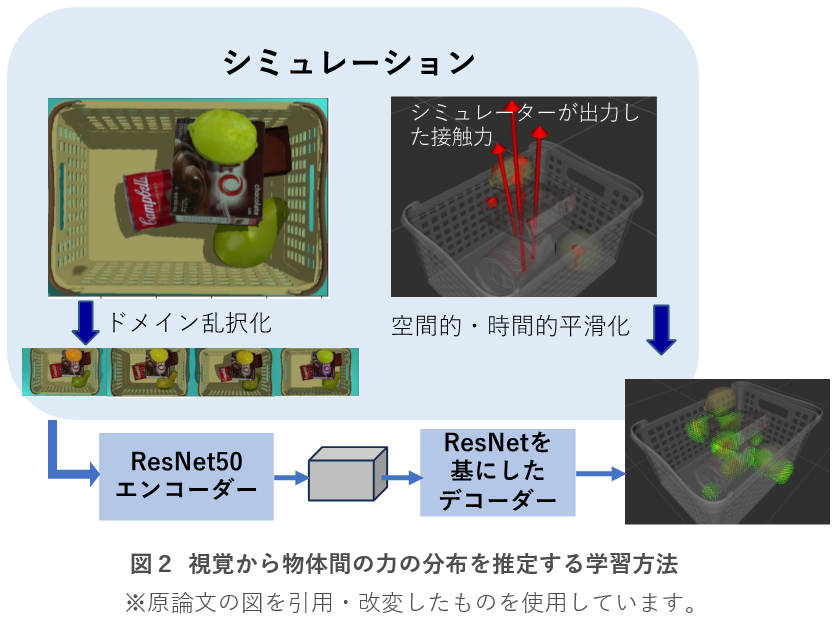図2は提案手法による学習方法の概要です。視覚情報に対して正確な力分布を得ることは現実世界では困難です。ここでは物理シミュレーターを使い、ランダムに配置される日用品の3Dモデル間にかかる「物体間に働く力」を物理演算に基づき計算しています。しかし、物理シミュレーター上の物理演算は正確に実世界の物理現象を再現しません。そのため、正確な力の量を推定しようとすればシミュレーションと現実のギャップ(機械学習の研究ではドメインギャップといわれます)を埋めるために膨大な労力を必要とします。そこで研究チームは、正確な物体の力の量ではなく、物体間のおおまかな力の分布に着目をしました。この場合、物理シミュレーションで得られる情報でも時間的・空間的な平滑化を行うことで比較的安定して現象を再現することがでます。そのため、AIに大量の経験を積ませなくても、ドメインギャップを埋めやすいことがわかりました。この工夫に基づきシミュレーター上で仮想経験データを生成することで、図2に示すように、視覚的情報を入力し、物体間の力分布を出力する深層学習モデルを訓練しました。モデルはResNet50をエンコーダーとし、ResNetを基に設計したデコーダーと組み合わせることで構成しました。その結果、図1に示したようにゼロショットでの実カメラへの適用が可能となりました。通常シミュレーションを現実に似せることで学習効率を高めますが、今回は「現実では得難い経験」を積ませることで、現実世界での経験を補完した点も、技術的に重要な成果です。