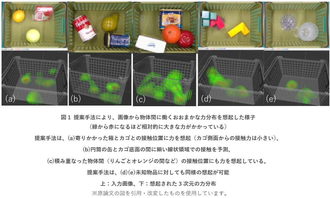花井らは視覚センサーにより得られる画像に写る物体が周囲の物体と接触することで生じる力のおおまかな分布を想起し、リアルタイムに3次元で可視化することに成功しました。今回開発したAI技術では、物体同士が接触することで生じる力を画像から推定し、力の大小を視覚的に表現することができます。図1にその例を示します。図1上は視覚センサーによる入力画像、図1下はその入力画像からAIが想起した力のおおまかな分布を可視化したものです。カゴの中にある物体が(カゴの側面や底面を含む)周囲の物体と接触することで生じる力の大きさを、緑から赤の色で表しており、赤に近い色ほど相対的に大きな力がかかっていることを表しています(ただし、図を見やすくするために一定値よりも小さい力は表示していません)。さまざまなシーンにおいて物体とカゴの側面や底面、物体同士の接触位置周辺に力がかかっています。また対象物にはAIの学習に使われていない未知物体が含まれています。これは提案するAIが多様な日用品に対する汎化性能を獲得できる可能性を示しています。さらに提案手法はシミュレーション内で学習をしていますが、現実環境に適応するにあたって追加学習をしていません。これは機械学習の研究において、ゼロショット転移といわれるものです。仮想世界で学習したAIをそのまま追加学習なしで現実世界に適用できるため、学習効率が良く、応用がしやすいことを表しています。このように画像1枚(カメラ1台)から日用品の物体間にかかる力分布をリアルタイムに推定できるAI技術を実現しました。