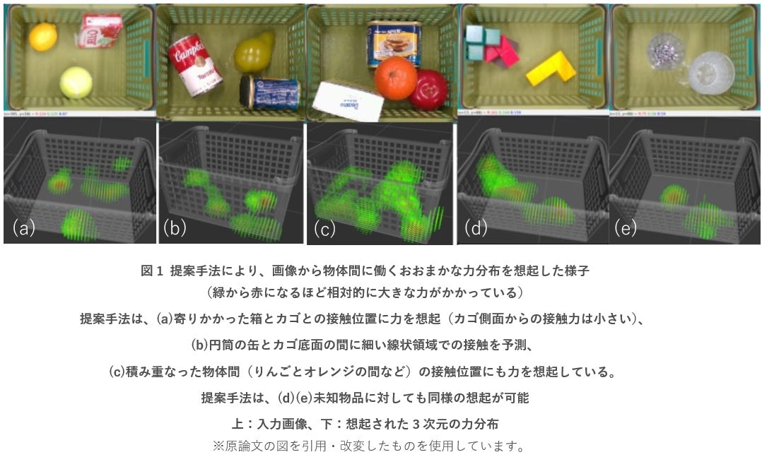 実験では、カメラ1台で未知の物体間に発生するおおまかな力分布をリアルタイムで可視化することに成功しました。また力分布を理解したロボットが周辺の物体の損傷が小さくなるように指定された対象物を持ち上げるなど、人間らしい推論に基づく行動ができることを確認しました。今後、ロボットによる丁寧な物体操作や、自動運転における事故予測などに役立つことが期待されます。