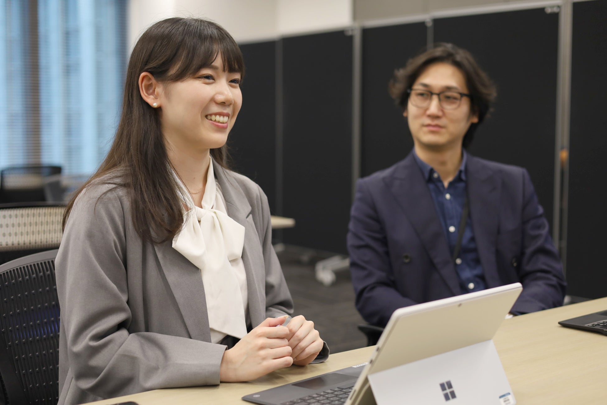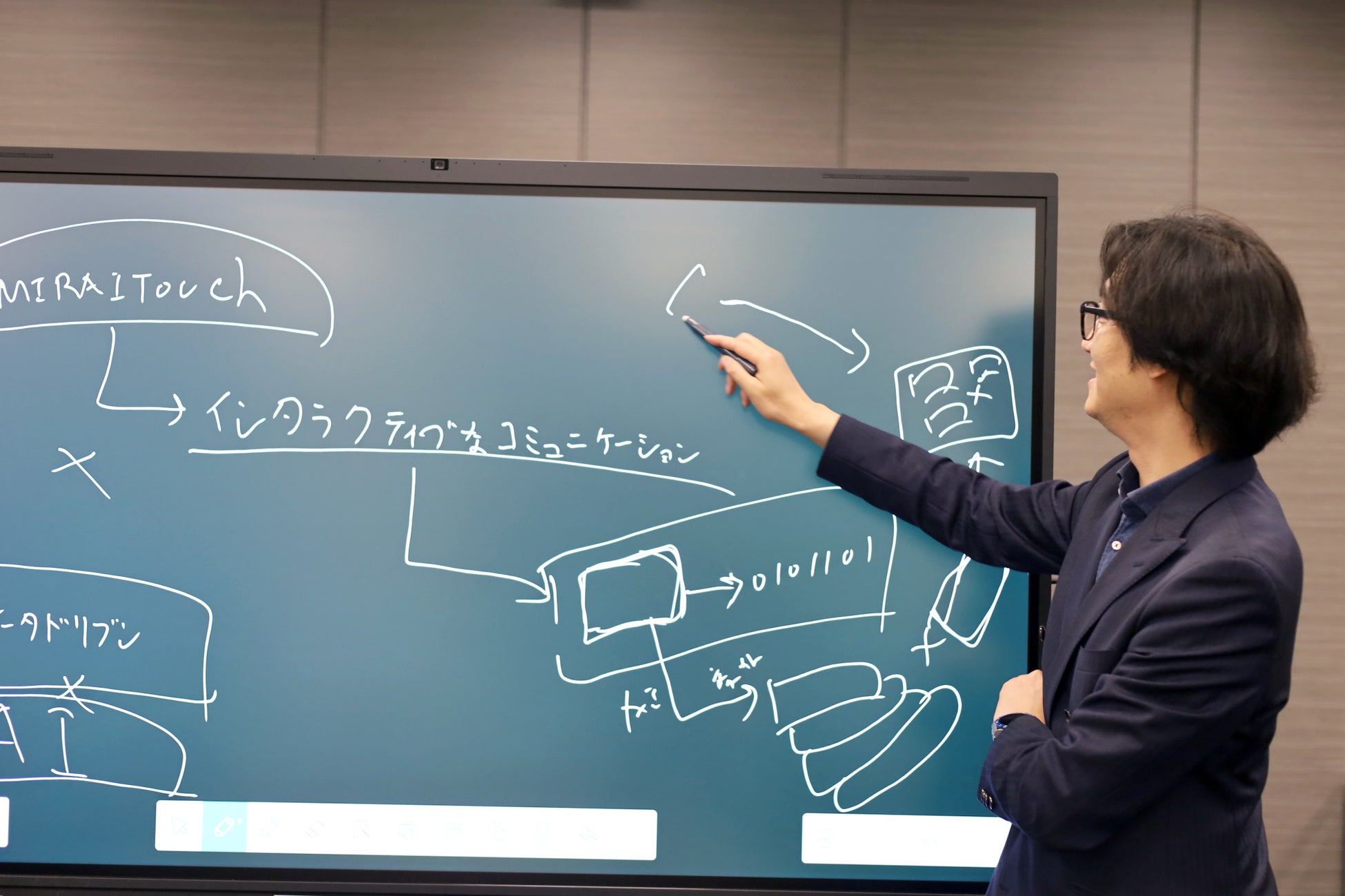 ●ミライタッチBizが設置されているフロアでは、皆がいつも気軽に利用している。電源を入れたら瞬時に起動するので、思い立った瞬間に文字を書けたり、簡単に板書のスクリーンショットを別のデバイスに転送できたりするのが便利。ミライタッチBizがあるおかげで、以前よりもメンバー同士で議論する機会が増えた。