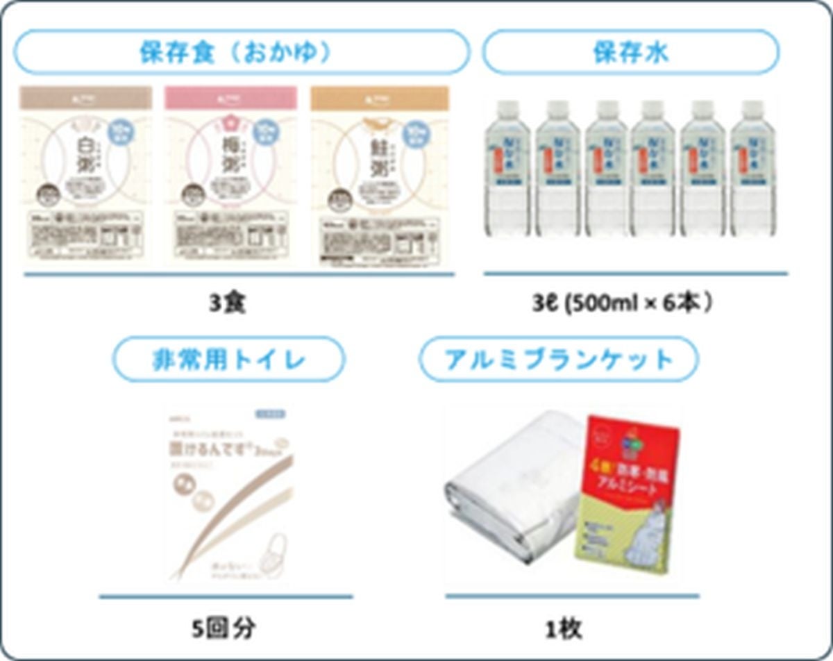 備蓄品は、保存食、保存水、非常用トイレ、アルミブランケットをパッケージした内容になっています。政府のガイドラインに沿ったオフィスでの非常時の備蓄量をクリアしているので、緊急時も安心です。
