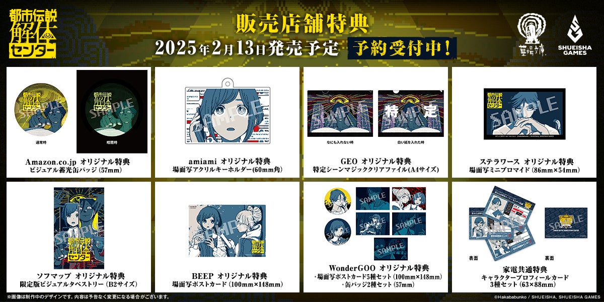 株式会社集英社ゲームズ(本社:東京都千代田区、以下 集英社ゲームズ)は、2025年2月13日発売を予定している『都市伝説解体センター』の全12法人(9アイテム)で実施する販売店舗特典を『都市伝説解体センター』特設サイト内にて本日発表したことをお知らせいたします。販売店舗特典は、ビジュアル蓄光缶バッジ、場面写アクリルキーホルダー、特定シーンマジッククリアファイル、場面写ミニブロマイド、限定版ビジュアルタペストリー、場面写ポストカード、場面写ポストカード5種セット、缶バッジ2種セット、キャラクタープロフィールカード3種セットを予定しております。