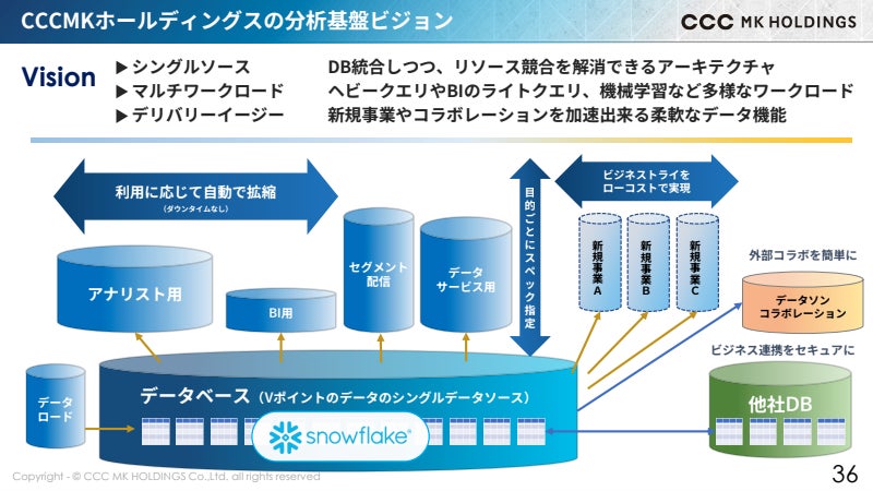 CCCMKホールディングスでは、共通ポイント「Vポイント」を通じたあらゆる顧客データを扱い、それらを通じて最適なキャンペーン施策の提案から購買検証に至るまでのマーケティングを提供しており、データの取り扱いそのものがビジネスの根幹となっています。松井氏は冒頭、CCCMKホールディングスとそのグループ会社におけるSnowflake導入史を説明。2021年から段階を経て、他社クラウドサービスプロバイダーからのマイグレーションを完了させ、それまでCCCMKホールディングス全体で保有していなかった全社的なデータ分析基盤をSnowflakeで構築しました。Snowflakeを活用することで全社間でストレージレス・データウェアハウスとしてデータを共有し分析することができるようになり、分析環境のモダン化が完了したことを説明しました。