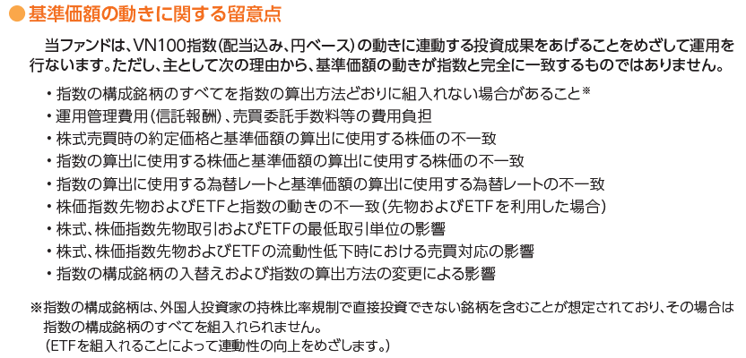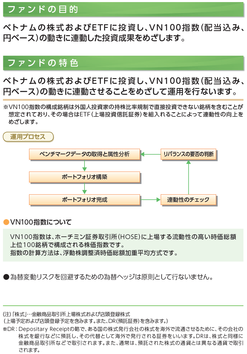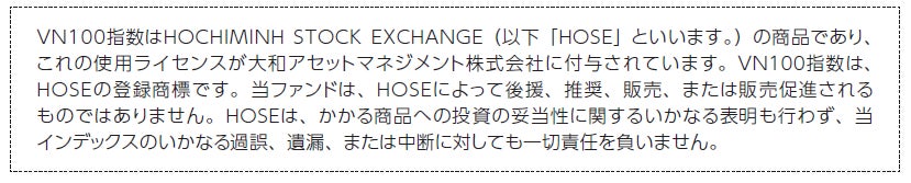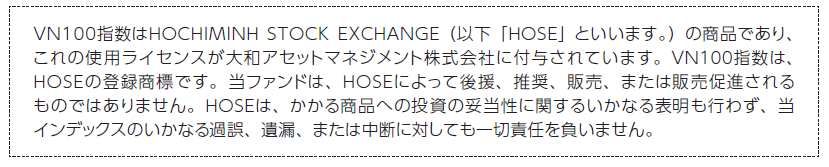 当ファンドは、ベトナムの株価指数であるVN100指数(配当込み、円ベース)に連動する投資成果を目指す、国内初*のインデックスファンドであり、低コストでベトナム株にご投資いただけます。
