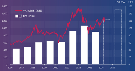 VN100指数とEPS(1株当たり利益)の推移 (VN100指数:2016年1月〜2024年4月末)(EPS:2016年〜2025年)