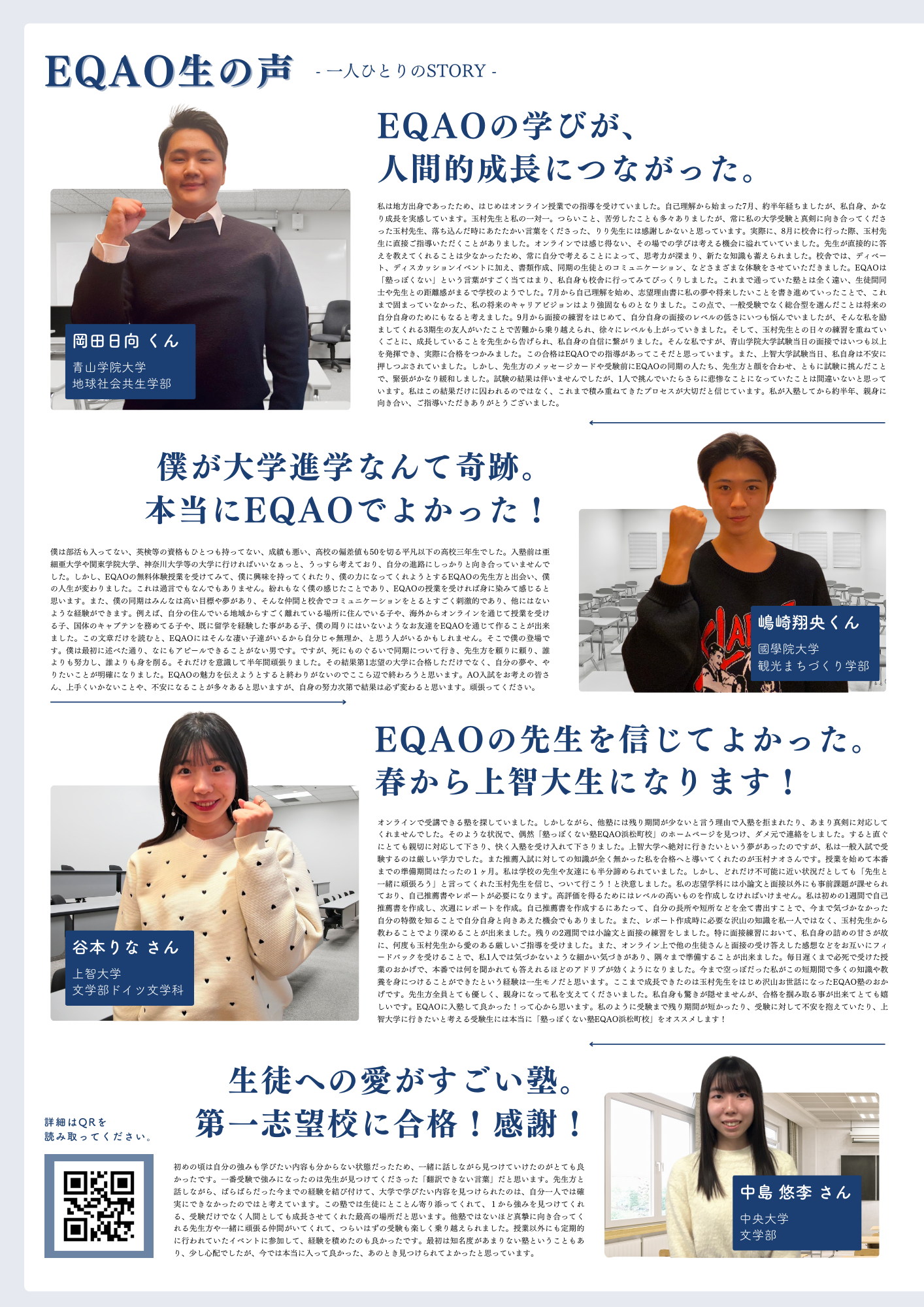 娘がこちらの塾で3期生としてお世話になりました。 1年前までは自分の将来像が見えず、進路についてかなり悩み、時には自暴自棄な態度もしばしばあった状態でした。そこで一般入試対策と並行して総合型選抜入試も視野に入れて対策をしていこうと本人とも話し、EQAOへの入塾を決めました。EQAOを選んだ理由として、他塾とも比較しましたが企業理念が素晴らしかったことと、まだ開校3年目ながら先生方の本気度が伺えたこと、費用的にも安価で対応いただけるということが挙げられます。行きたい大学も無い状態で入塾しましたが、先生方が親身になって娘のインサイトを引き出し、Visionを可視化していただくことによって、娘の受験に対する行動も日を追うごとに変化していきました。また入塾当初はオンラインのみの対応でしたが、夏から校舎ができたのでオンライン/オフラインの両方でご対応いただけ、そこで出会った塾生との出会いがさらに娘を成長させたと感じています。同じ志を持つ同年代からの刺激は学びを加速させ、まさに共に育む「共育」という場がEQAOにはあったと思っています。その成果もあり3校から合格をいただき、第一志望である上智大学の合格を勝ち取ることが出来ました。