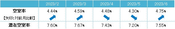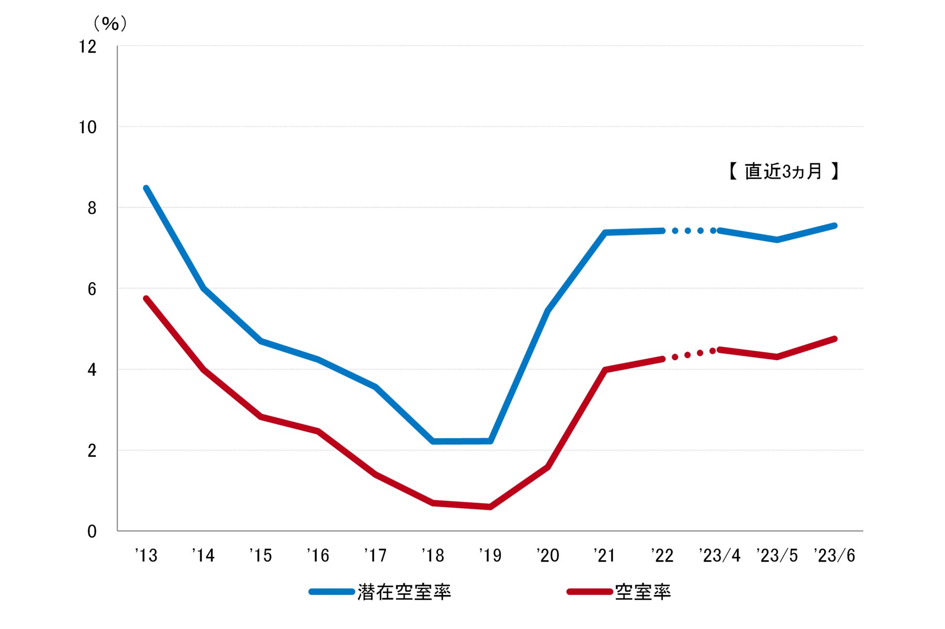 空室率は前月比プラス0.45ポイントの4.75%となった。新築ビルがまとまった面積の空室を抱えて竣工したことが上昇要因となっている。潜在空室率も前月比プラス0.35ポイントの7.55%となり、空室率同様に3ヵ月ぶりで上昇した。今年は20万坪超の大量供給が予定されるが、6月に新規供給のピークを迎えたことで空室率を一段と押し上げた形だ。