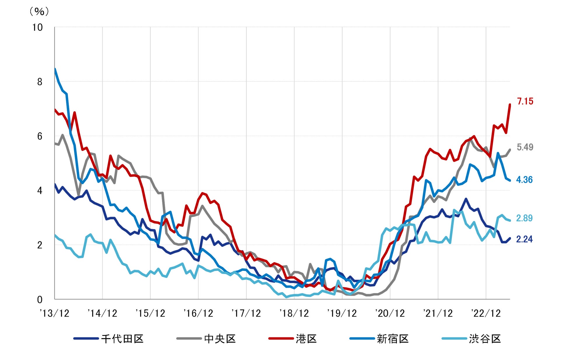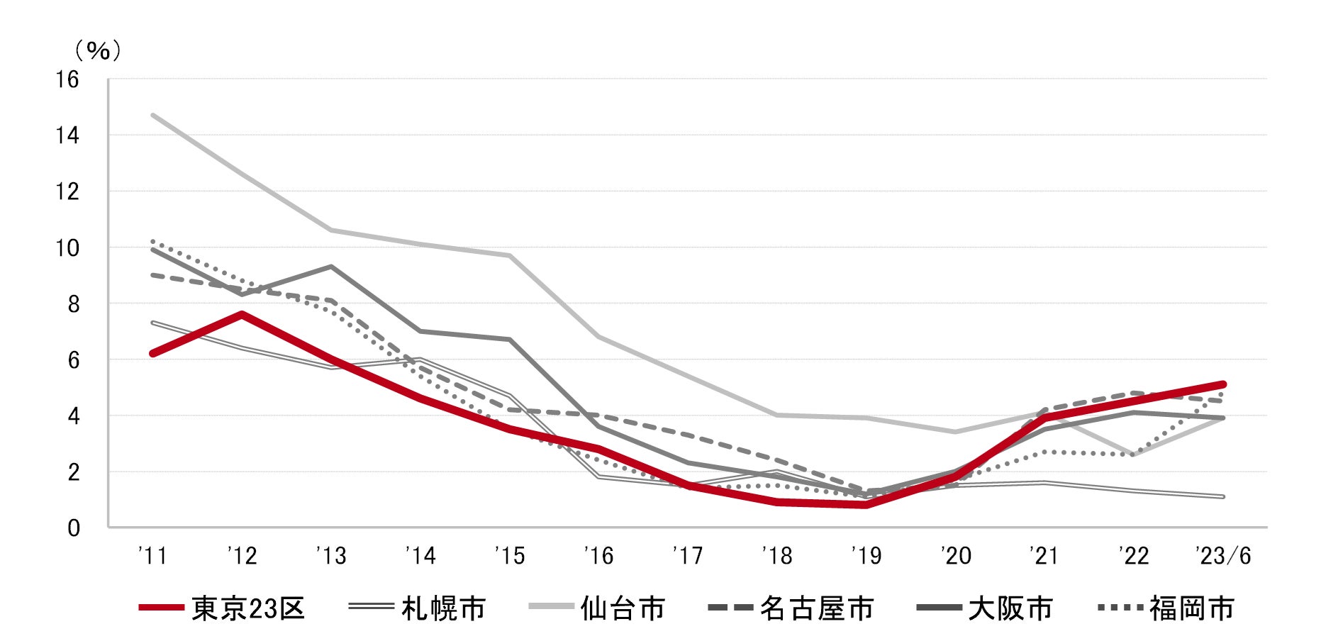 港区は新規供給が集中しており、ピークは越えたものの、今後も供給過剰による空室率の上昇が懸念される。