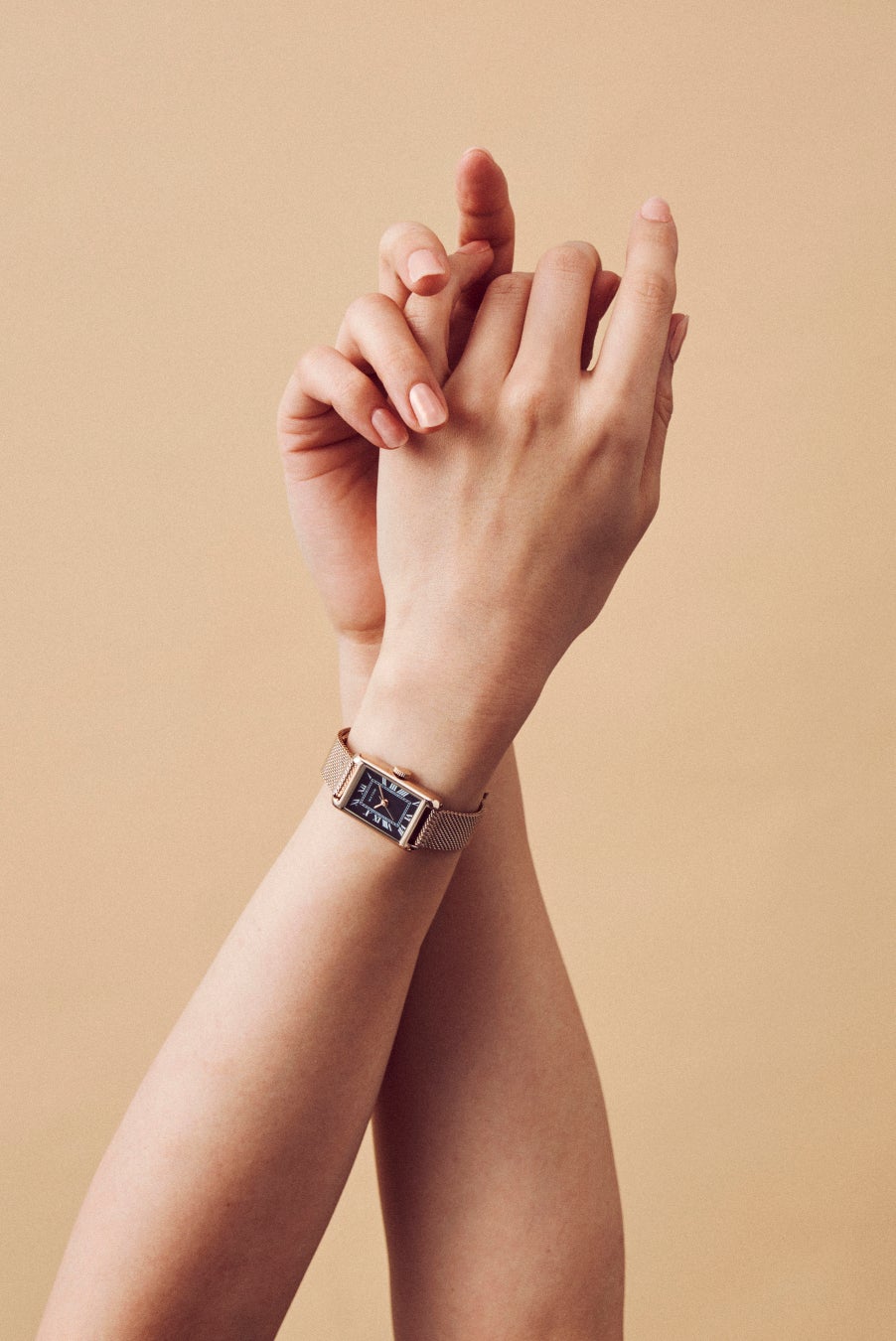 ケースは縦29mm×横18mmのコンパクトなレクタングル型で、手元にしっくりと馴染むサイズ感。カラーバリエーションは、シルバーステンレスケースに型押しレザーバンドを組み合わせたモデル(¥19,800税込)と、ローズゴールドケースにメッシュバンドを組み合わせたモデル(¥22,000税込)の2種類を展開。それぞれが異なる魅力を持ち、さまざまなシーンで活躍するデザインとなっています。