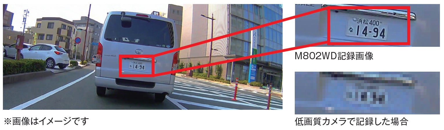 解像度1080Pの200万画素フルHD。フレームレート58fpsの高速録画は、シャープで鮮明に記録できるのでナンバーまでくっきり。全国のLED信号機に対応し、東日本/西日本いずれの周波数帯でも録画できるので安心です。