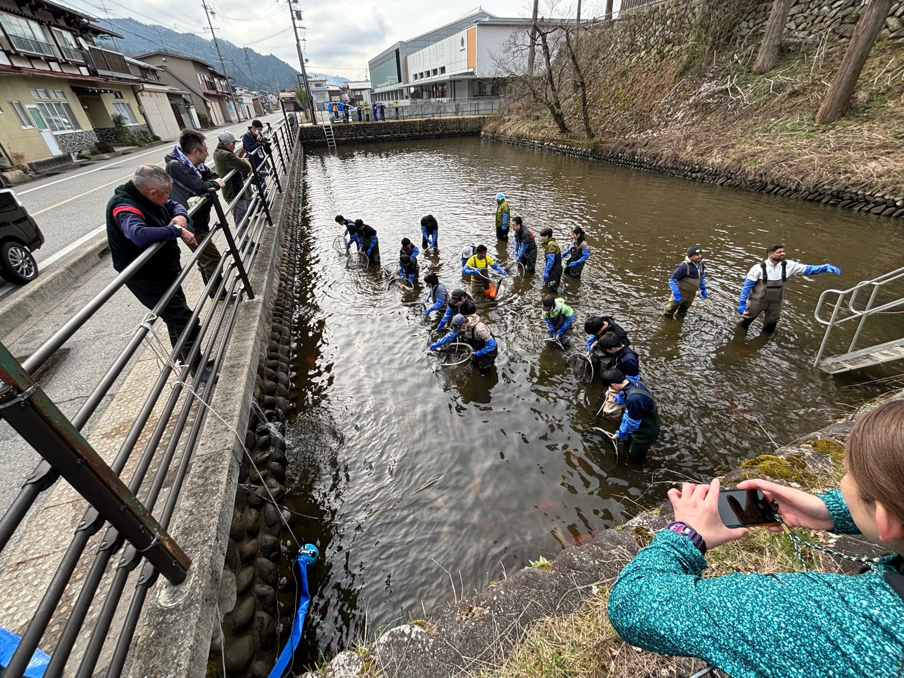 4月6日(土曜日)の朝、一般社団法人飛騨市観光協会や地元中学生、ボランティアら約50人が鯉の越冬先の池に集まり、池の中に入って鯉を網ですくい上げ、軽トラックの荷台に水を張って乗せて、瀬戸川まで繰り返し運んで放流しました。