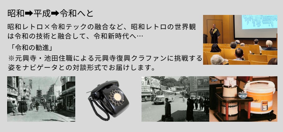 内容:ホテル日航奈良スペシャルデザートプレート、昭和の歌謡ショー、昭和の 時代劇、写真家・入江泰吉昭和の映像ショー、昭和レトロ博物館(昭和の家電・ 家具・玩具など展示)、昭和クイズ、令和の勧進(元興寺)など昭和尽くしの一日。
