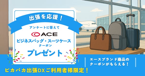 また、アンケートにご協力いただいた方への感謝の気持ちとして、出張者に人気の高い「エース株式会社」のビジネスバッグ・スーツケースクーポンを進呈いたします。